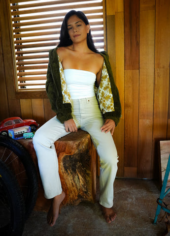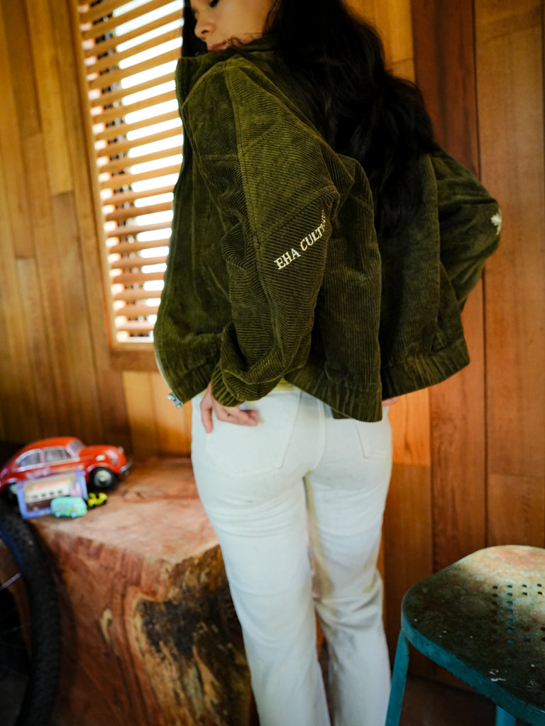 The newest High Society Corduroy Bomber Jacket, now in a dark olive green color.